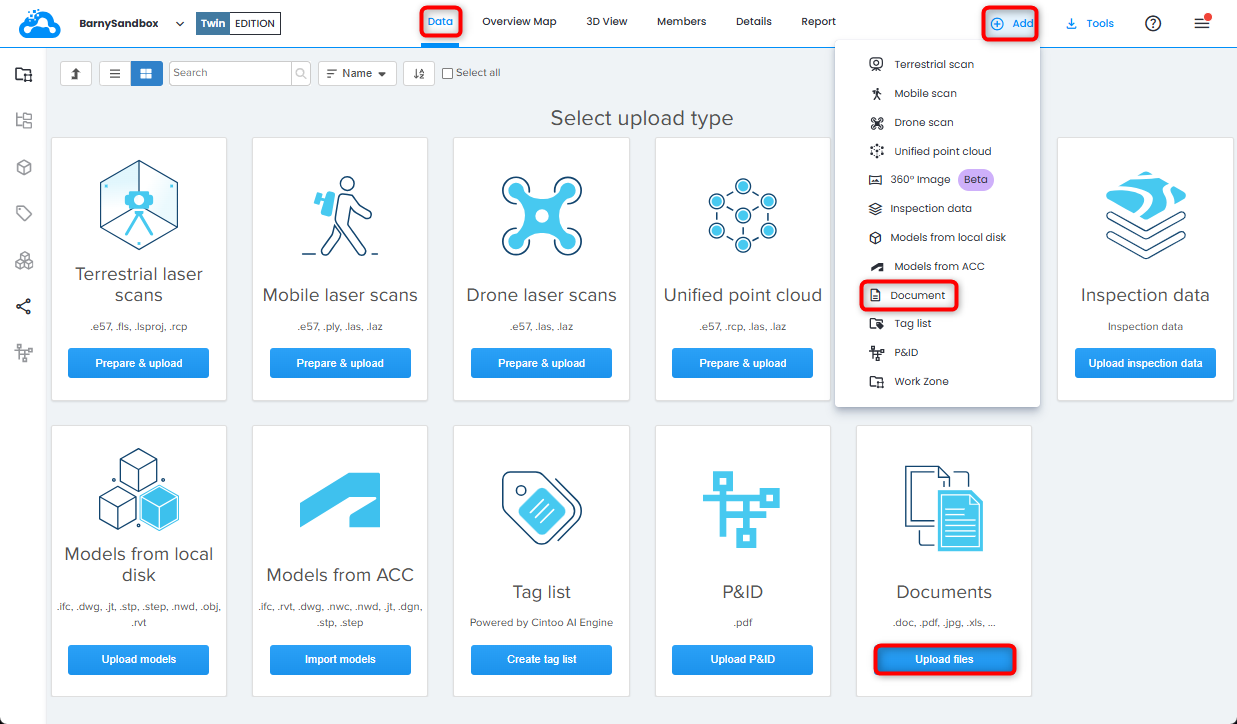 Folgen Sie den Anweisungen unten, um Dokumente (z. B. .jpg, .png, .pdf usw.) zu Cintoo hochzuladen.