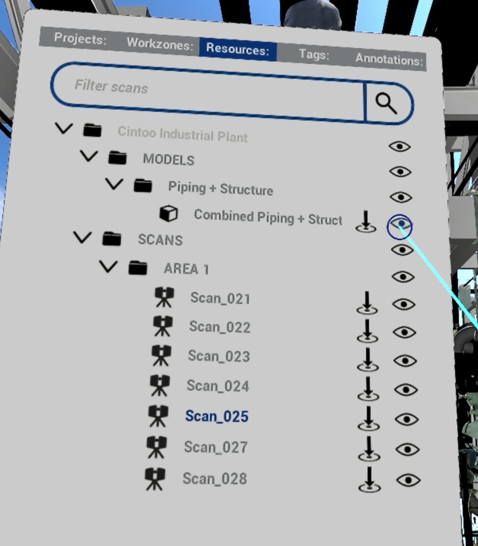Steuern Sie die Transparenz von Scans oder Modellen, indem Sie den Punkt auf der Linie mit der Auslösetaste auf dem Navigation controller bewegen. Modelle können mit Scans getauscht werden, indem auf den doppelseitigen Pfeil zwischen Alle Scans und Alle Modelle geklickt wird.