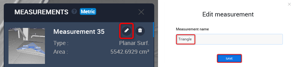 - Klicken Sie auf Bearbeiten , um den Namen einer Messung zu ändern. Im Bearbeiten Messung -Pop-up-Menü den Messung Name eingeben und auf Speichern klicken.