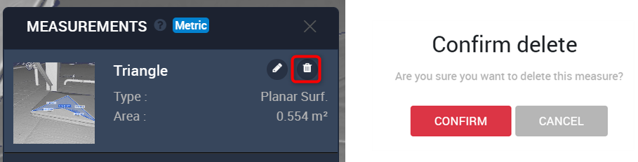 - Klicken Sie auf Löschen , um eine Messung aus dem Projekt zu entfernen. Im Bestätigen Löschen -Pop-up-Menü klicken Sie auf Bestätigen , um fortzufahren.