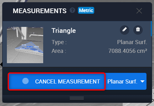 Messungen können nicht im 2D-Panoramadarstellungsmodus durchgeführt werden. Es muss einer der 3D-Darstellungsmodi sein (vorzugsweise Surface für mehr Präzision). Sobald eine Messung erstellt wurde, kann sie auch im 2D-Panoramamodus angesehen werden.