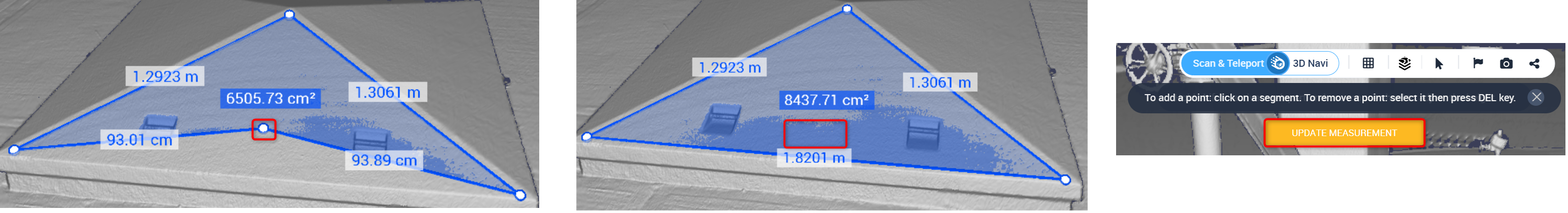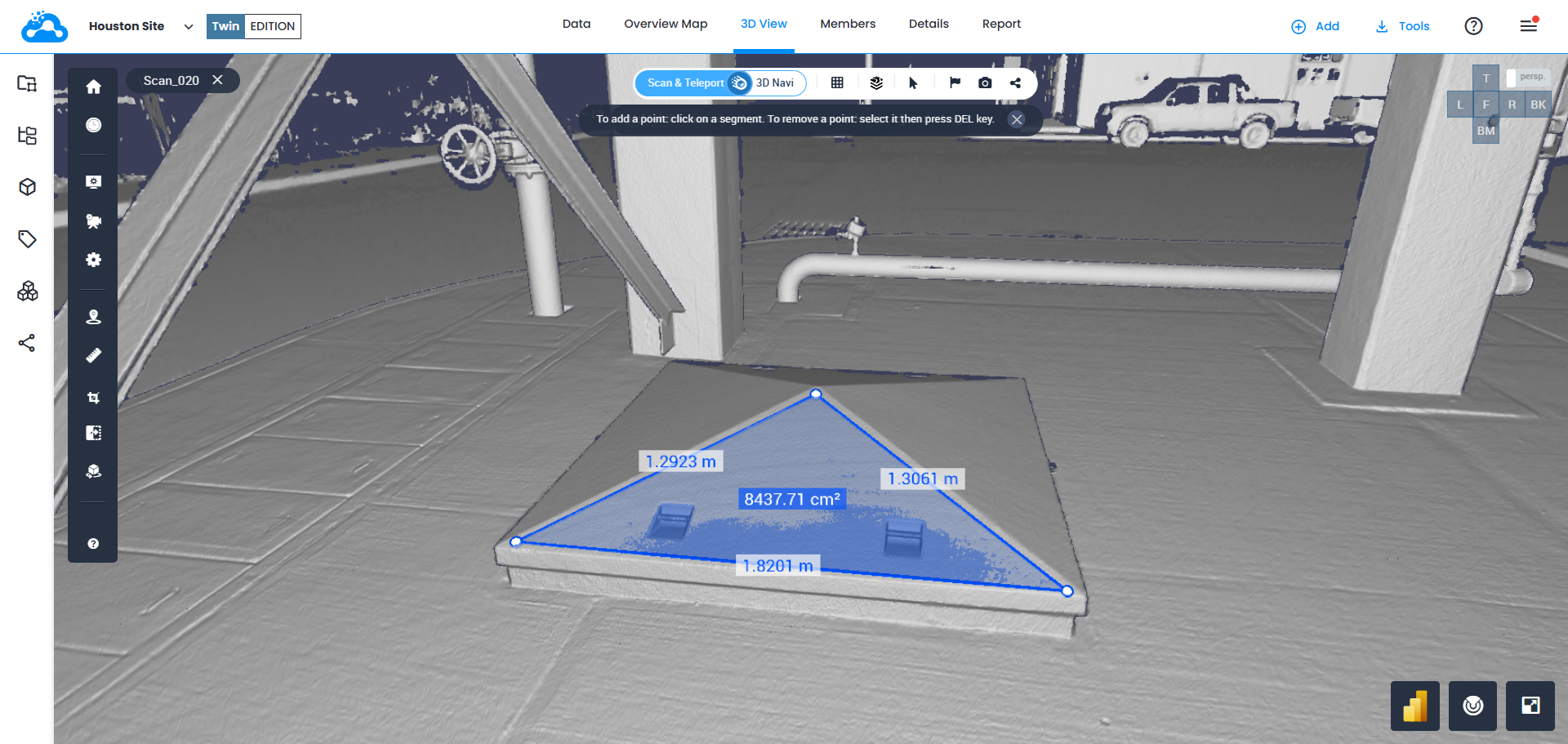 Messungen können in Cintoo in der 3D-Ansicht entweder im Scan&Teleport -Modus oder im 3D-Navi-Modus durchgeführt werden.