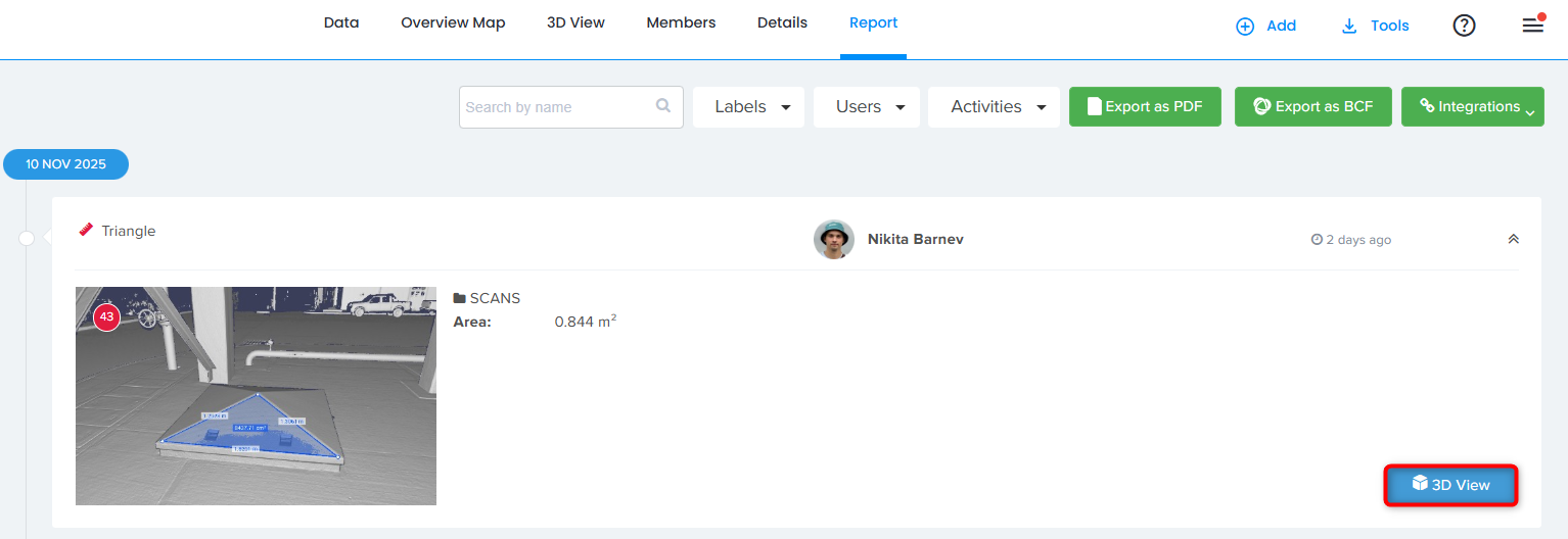- Jeder Titel eines Elements des PDF-Berichts ist anklickbar und zeigt die entsprechende Messung in Cintoo an.