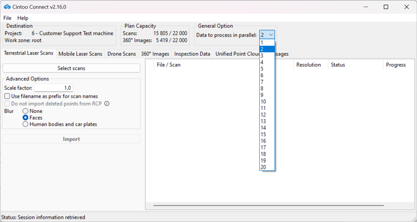 - If some scans have a resolution lower than 1,000 pixels in one axis, they will be automatically unselected. This usually corresponds to survey points, which do not need to be uploaded. To include them, click the check box in the Cintoo Connect scan list.