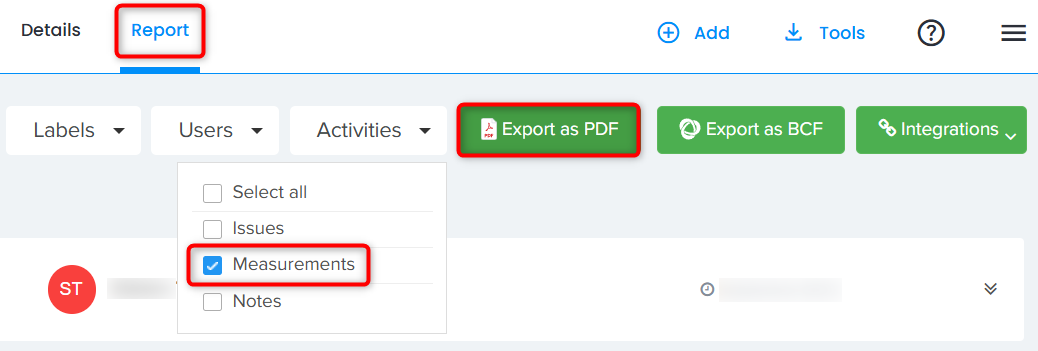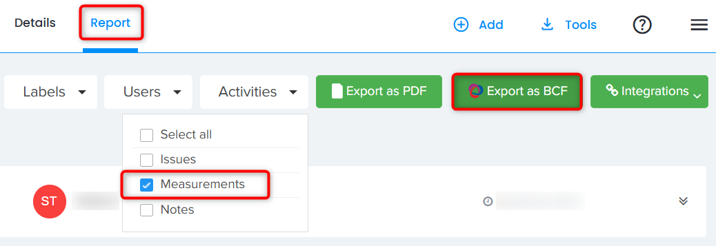 2. Measurements could be exported as BCF from Report tab.