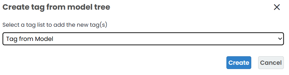 5. In pop-up Create tag from model tree window choose a tag list to add the tag to and click Create.