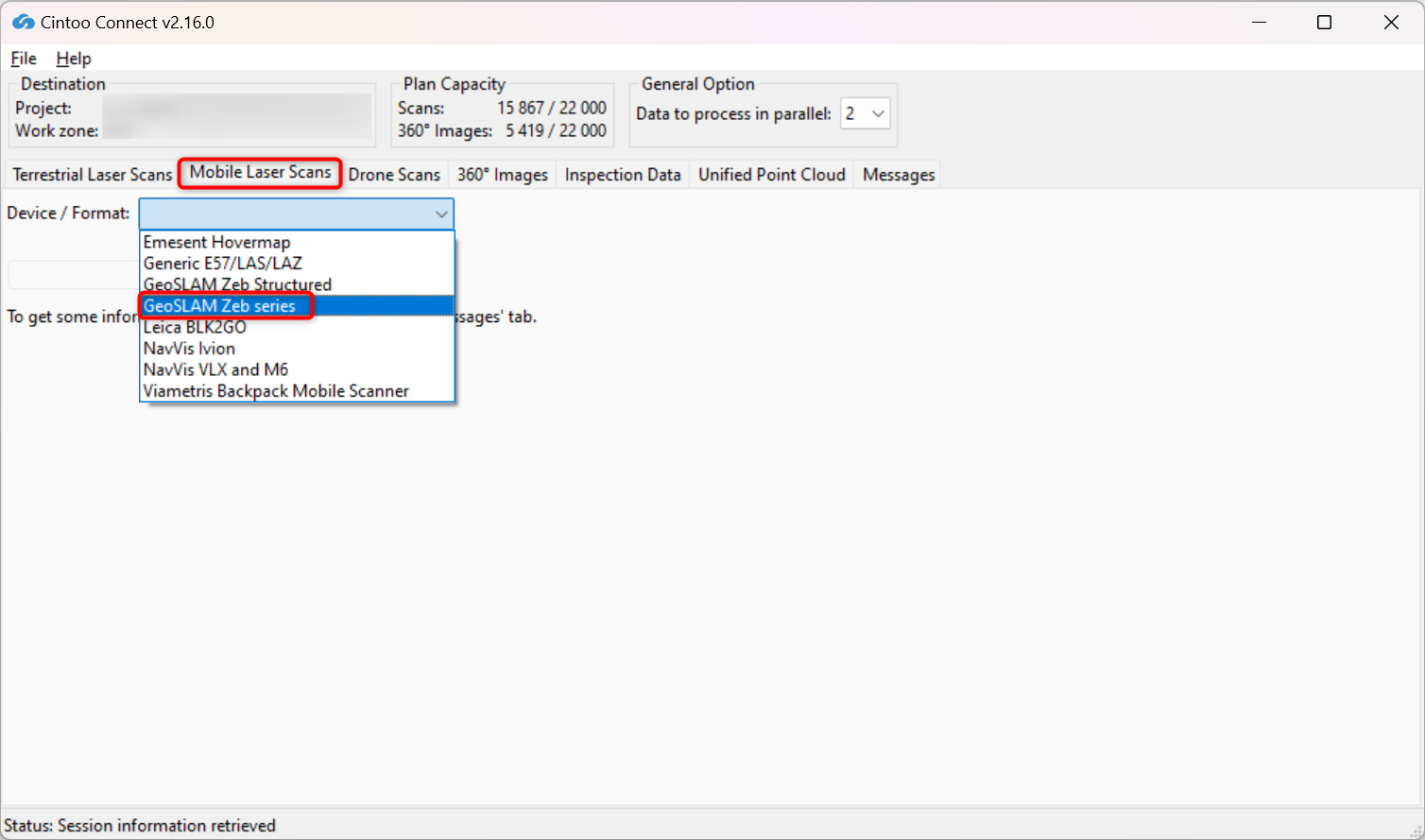 2. Dans l'onglet Balayages Laser Mobiles, sélectionner GeoSLAM Zeb series