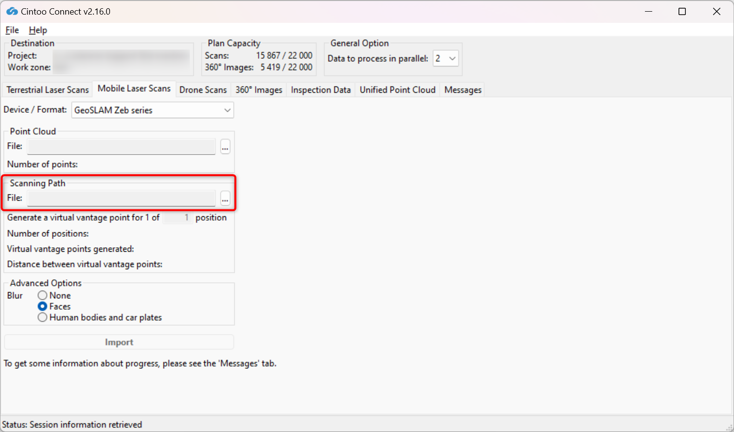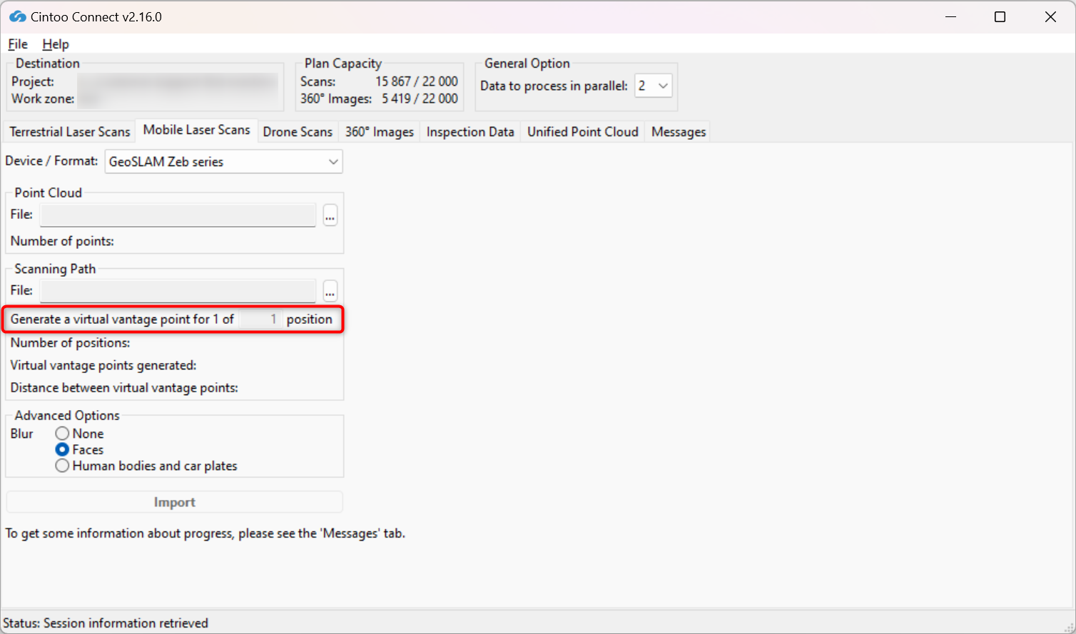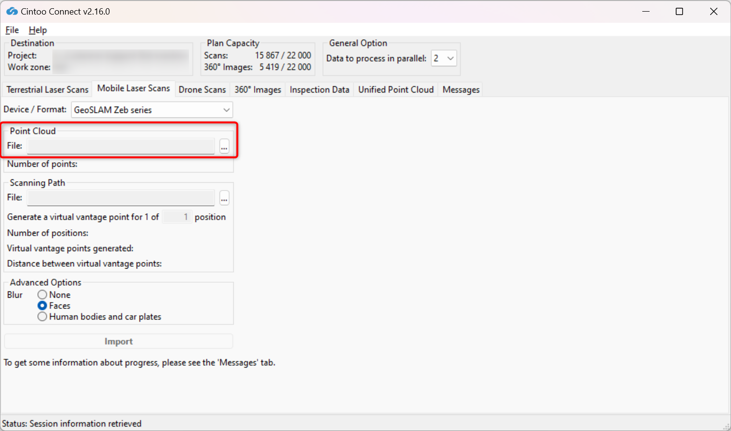 - Les fichiers téléchargés sans l'option Floutage des visages activée doivent être supprimés du projet Cintoo et recréés avec l'option cochée pour appliquer le floutage automatique des visages.