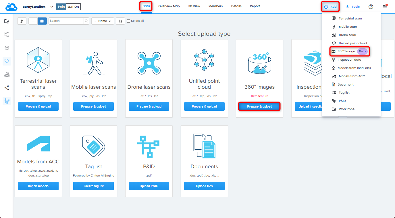 2. Dans cette zone de travail, ouvrir l'onglet Données et cliquez sur Préparer & télécharger sur Images à 360 ou cliquez sur Images à 360 à partir du menu déroulant Ajouter en haut à droite. Cintoo Connect se lancera.