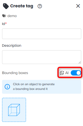 Le marquage manuel dans Cintoo consiste à utiliser l'outil boîte englobante pour délimiter l'équipement dans Vue 3D et définir manuellement l'ID de la balise et les métadonnées.
