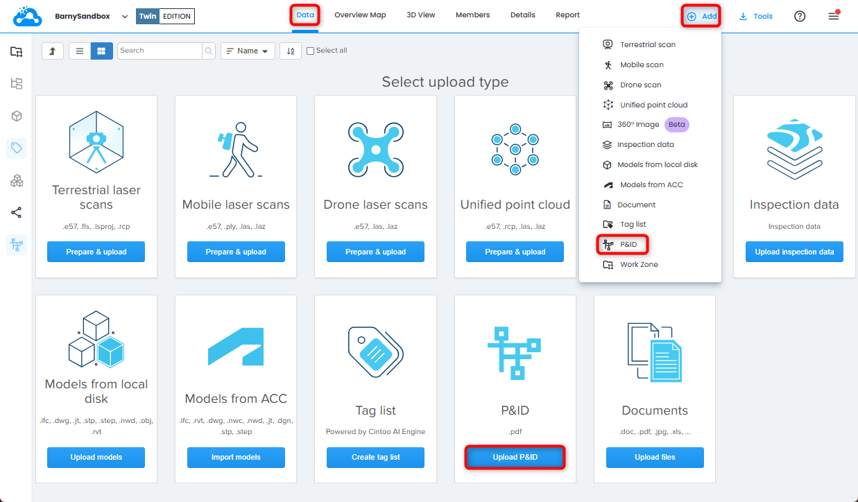 1. Ouvre Données onglet et clique Télécharger P&ID sur P&ID tuile ou clique P&ID de Ajouter déroulant menu en haut à droite.